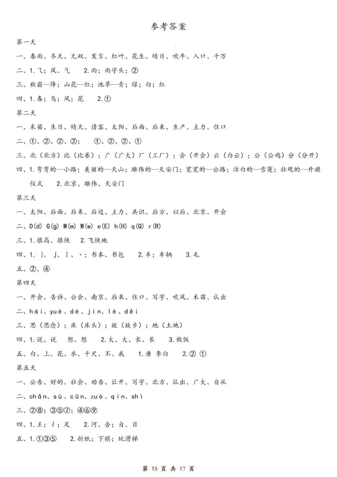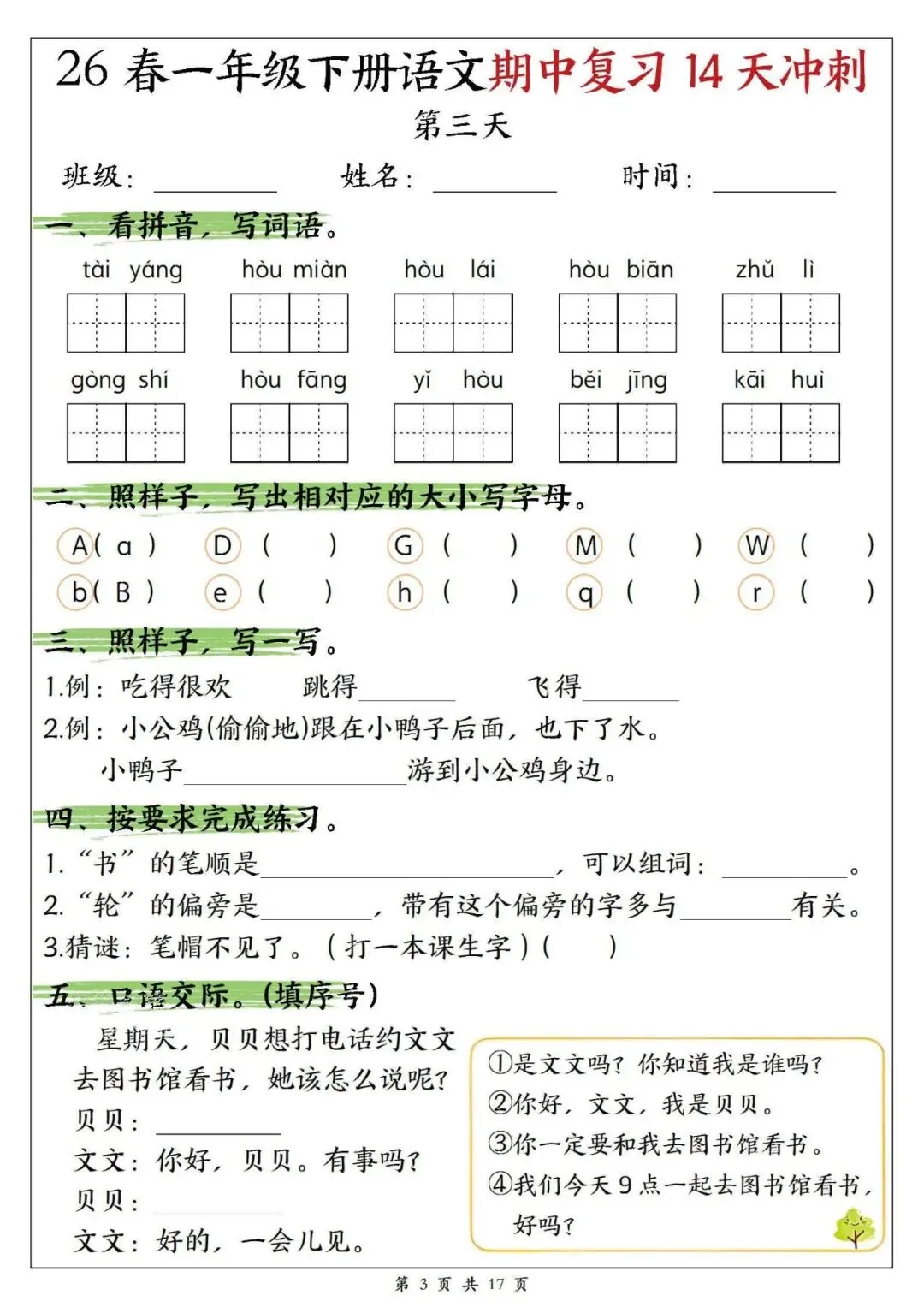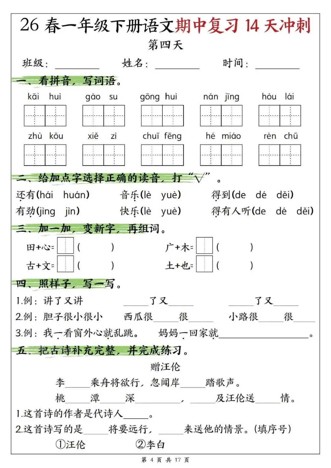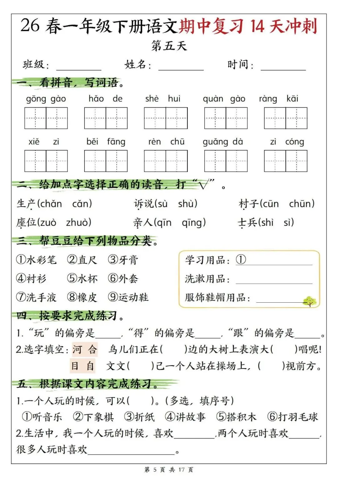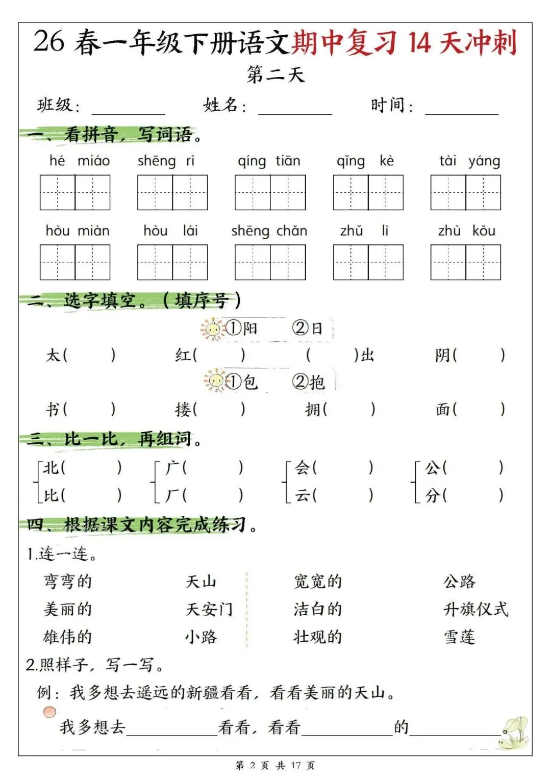 【免费下载打印】2026春一年级语文下册期中复习14天冲刺(含答案17页),PDF电子版,先保存后下载