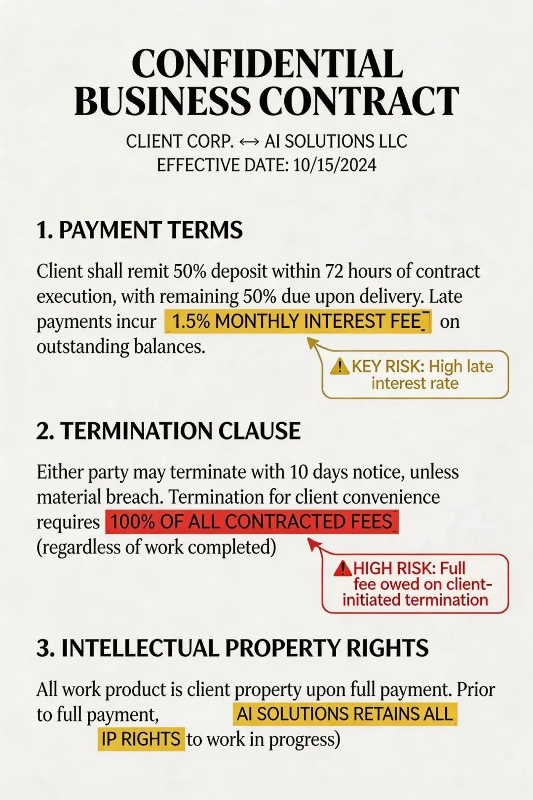 提问:”这份合同里,对我们不利的条款有哪些?””这个新政策对我们行业有什么影响?” -