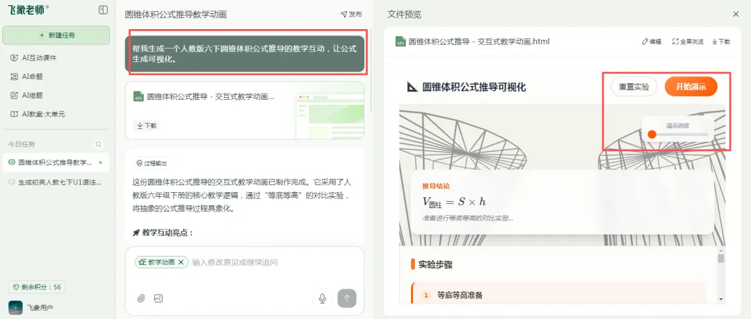 上图以生成“圆锥体积公式推导演示动画”为例,生成完成后,点击右侧的【下载】就可以下载动画。