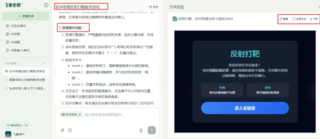 上图以生成“生成一个初中物理小游戏 —— 反射打靶”为例,生成格式是html。完成后点击右侧的【下载】可以下载教学游戏。