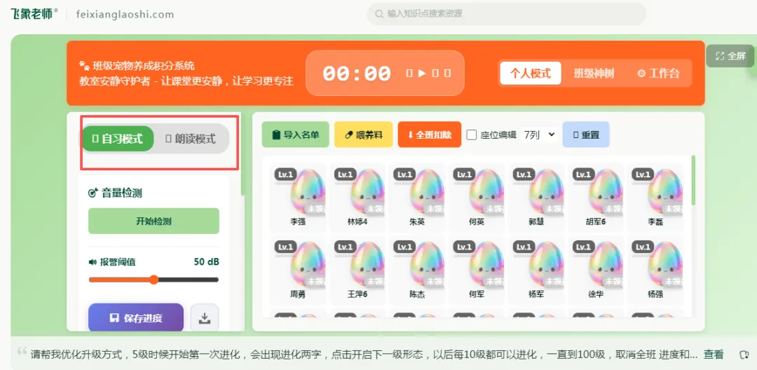 比如某红书卖10元的的“电子宠物”,使用前导入学生名单。就可实现类似于希沃班级优化大师的积分功能。有自习模式和朗读模式!