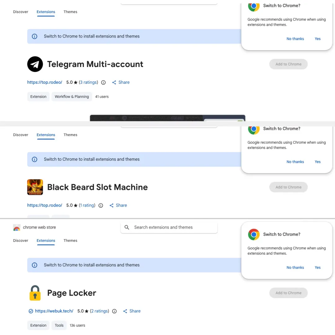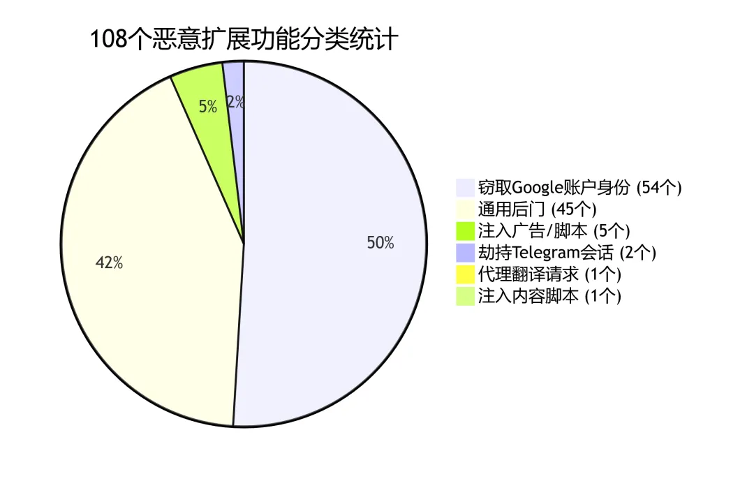 108个恶意插件 → 54个窃取Google身份 | 45个植入后门 | 2个劫持Telegram | 5个注入广告 | 1个代理翻译 | 2个注入脚本