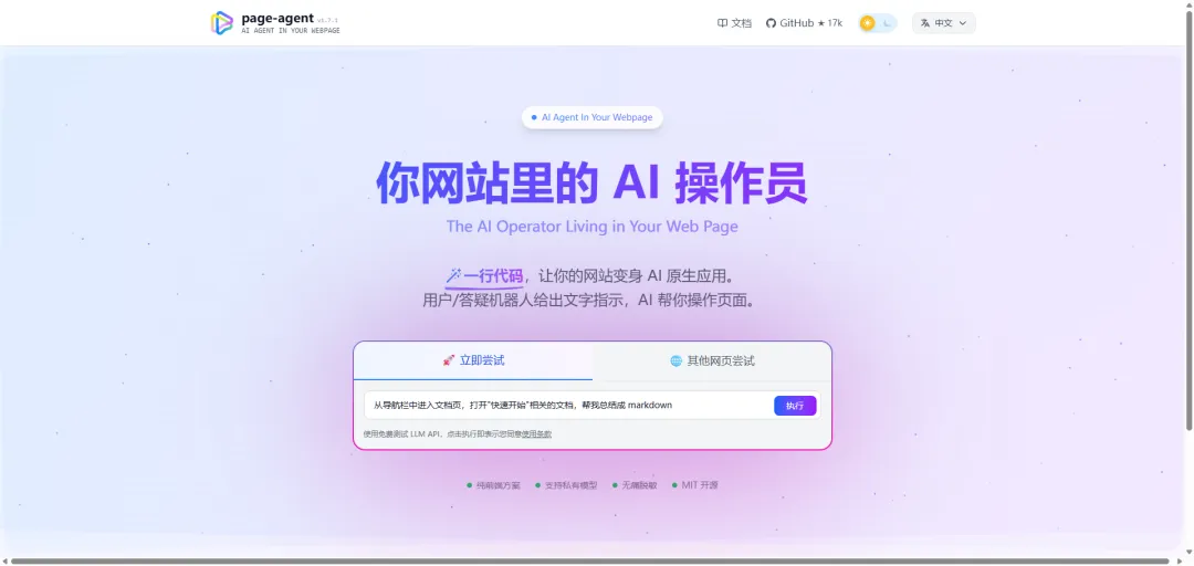 ✅ 一键部署:一行代码即可让网站支持AI原生交互。
