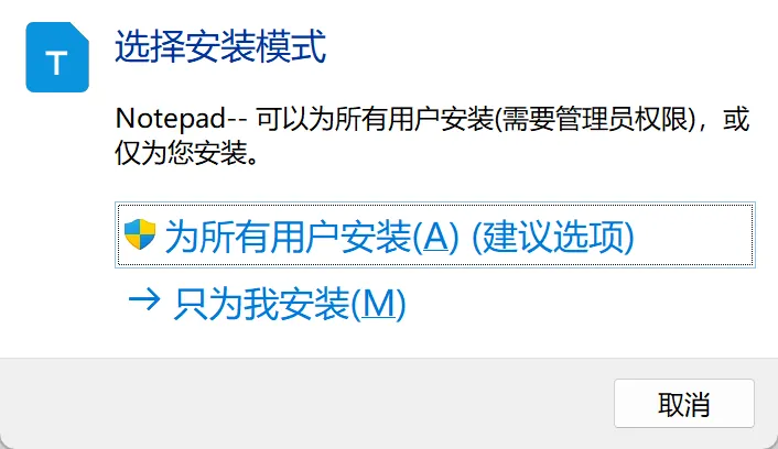 压缩包下载到本地之后解压到合适的路径,然后以管理员身份运行安装程序。首先需要选择安装模式,建议选择为所有人安装。