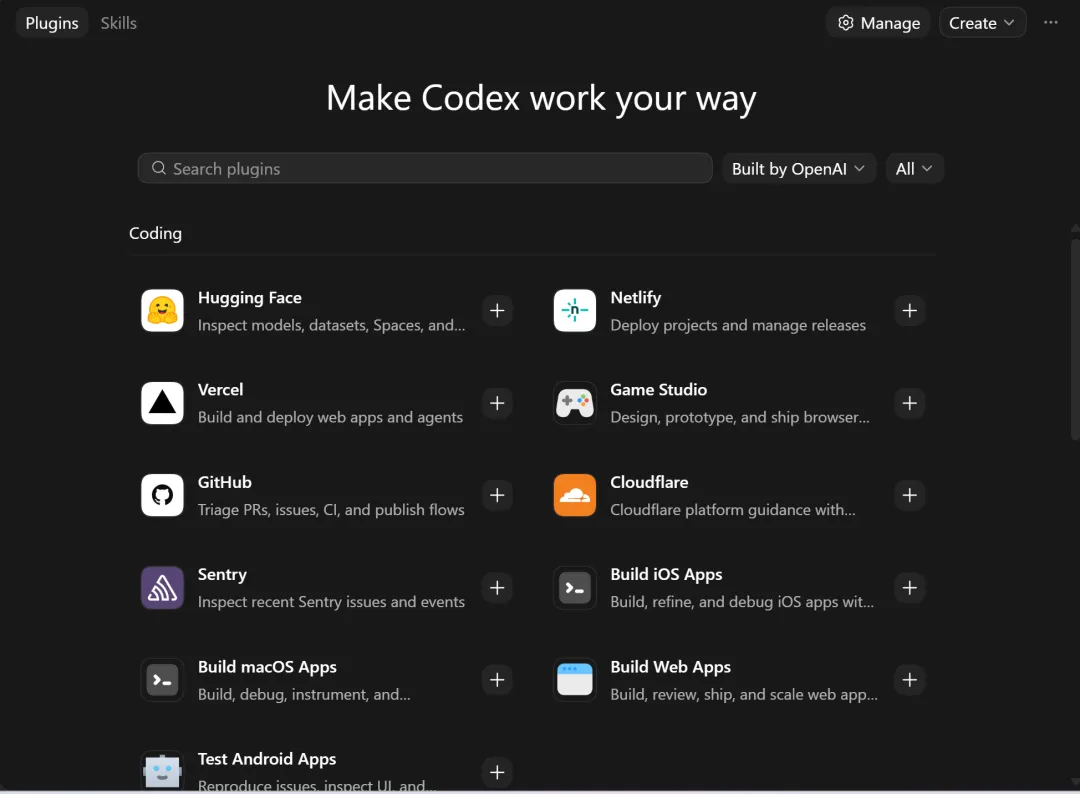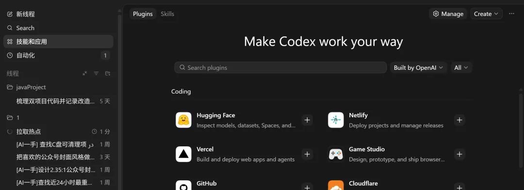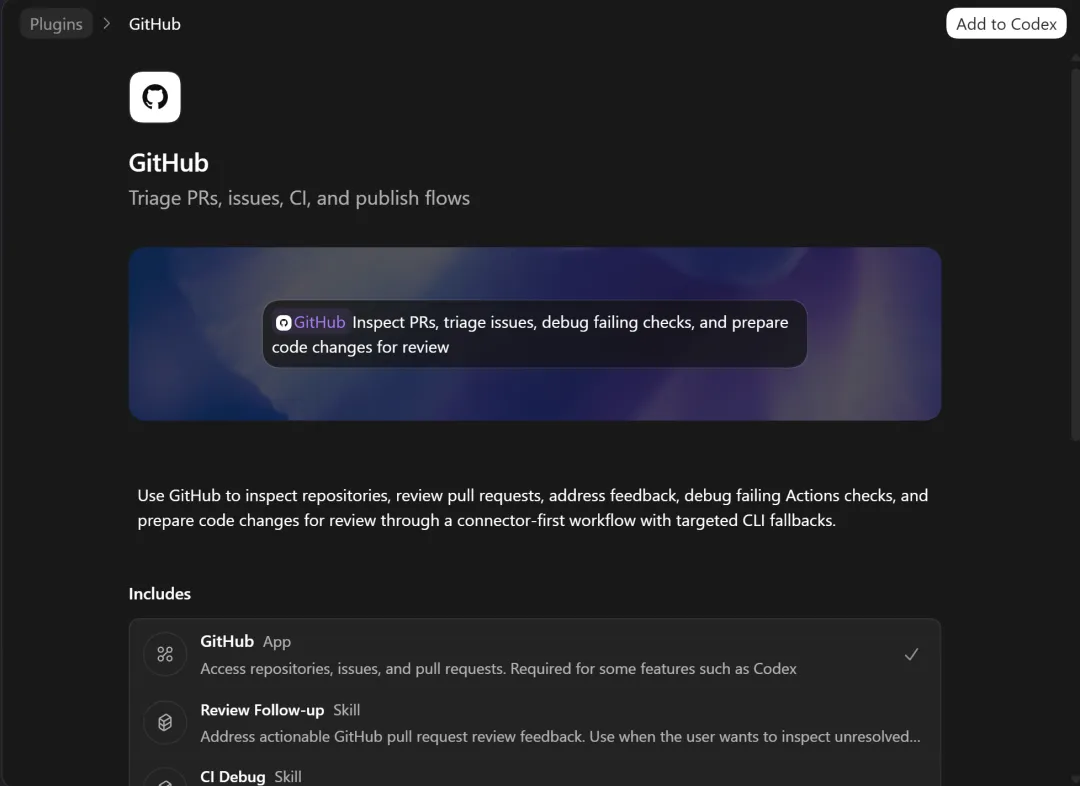 GitHub 是唯一一个国内读者普及度最高之一的海外服务。装完能让 Codex 直接管理你的仓库、issue、PR。场景泛用,OAuth 授权无门槛。如果你只想试一个 Plugin,就试这个。