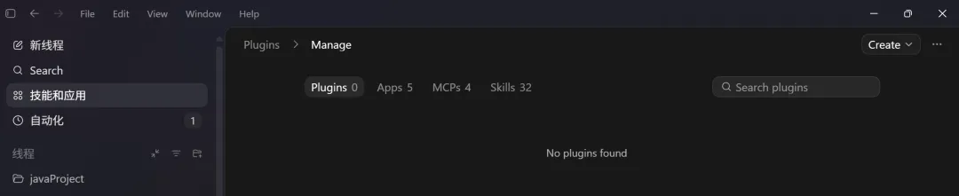 点开 Plugin 面板,顶部有四个 Tab,Plugins、Apps、MCPs、Skills。