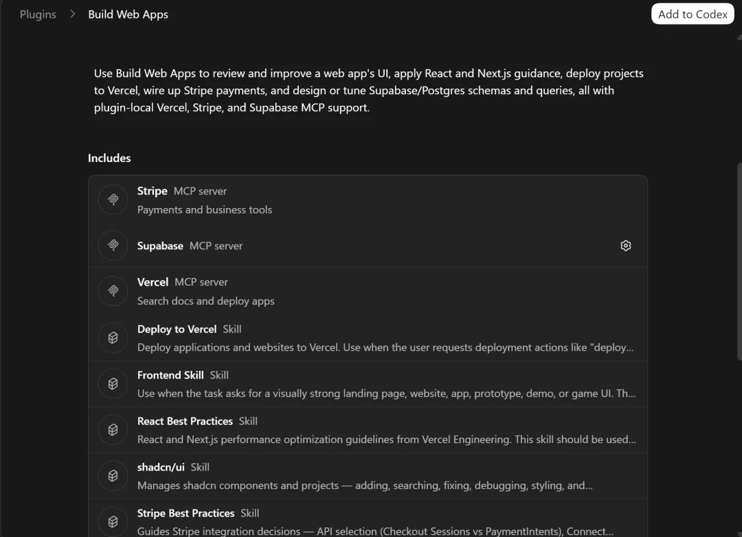 build-web-apps 这个 Plugin 比较特别,值得单独说一下。它一个 Plugin 里同时打包了 Stripe + Supabase + Vercel 三个 MCP 加一套建站 Skill。是目前官方目录里最复杂的一个,展示了 Plugin 的能力上限。但三个工具国内用户都有门槛,境外支付、境外服务器,做出海产品可以玩,做国内产品就算了。