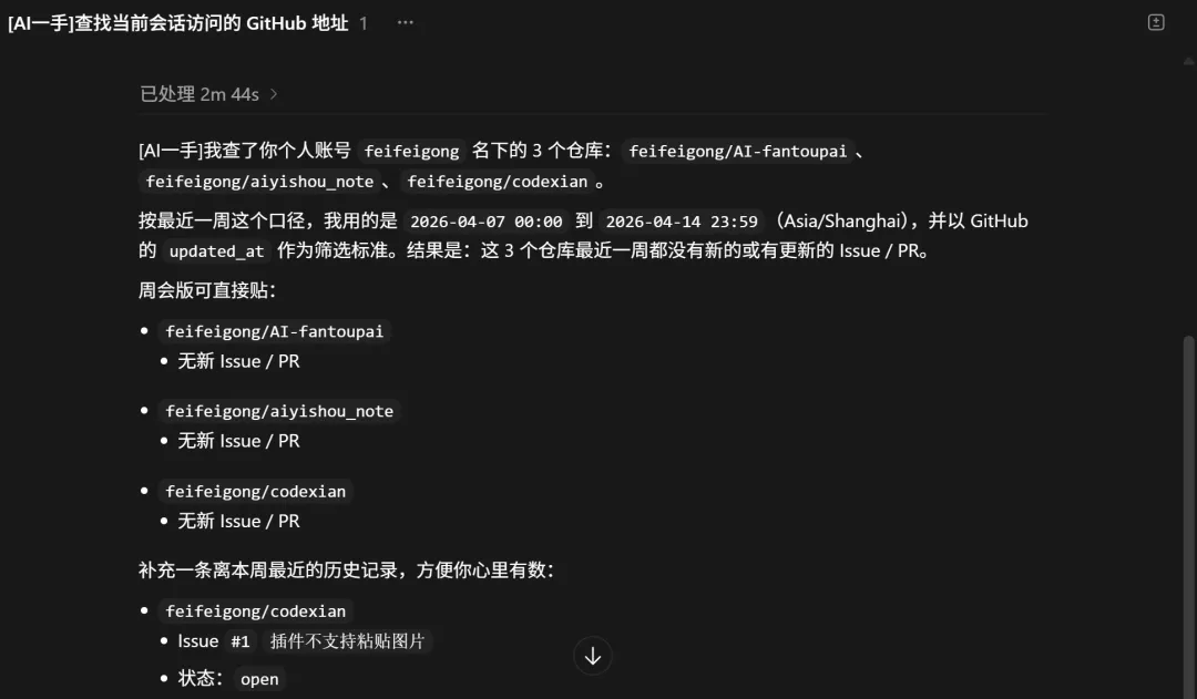 看一下我名下所有仓库,最近一周有新 issue 或者 PR 的列出来,按仓库分组,每条标注状态和 last update 时间。我周会要用。