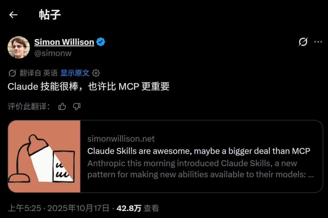 去年 10 月,Simon Willison 写了一篇爆款文章,标题就叫「Claude Skills are awesome, maybe a bigger deal than MCP」。