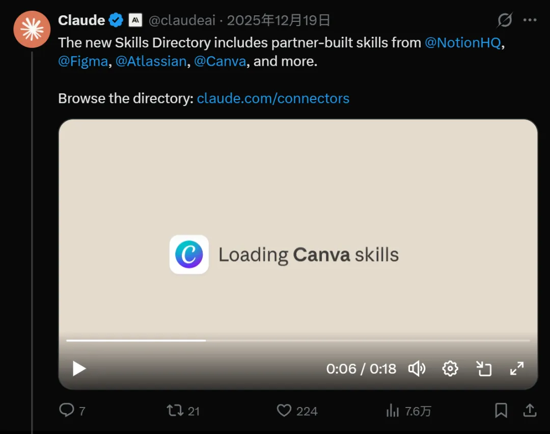 这波讨论的影响比很多人以为的要大。12 月 18 号,Anthropic 直接把 Skills 做成了开源标准,发布了规范和 SDK,Canva、Notion、Figma、Atlassian、Stripe、Zapier 都来做首发合作。