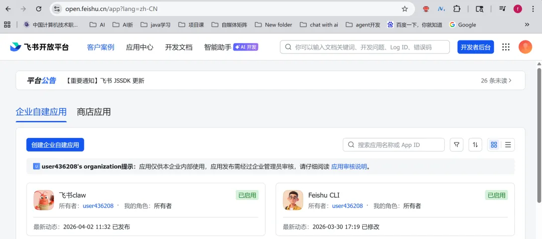 第一步,创建飞书自建应用。打开飞书开放平台,登录你的飞书账号,右上角「开发者后台」,点「创建企业自建应用」。