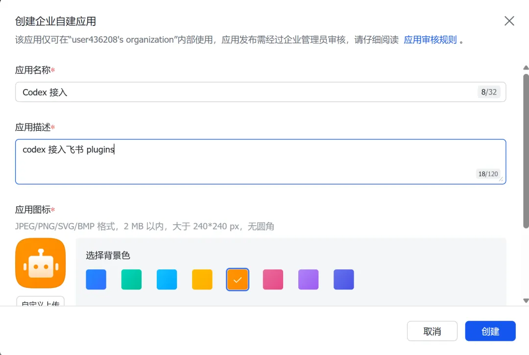 填个应用名字,比如「Codex 接入」,随便上传个 logo。