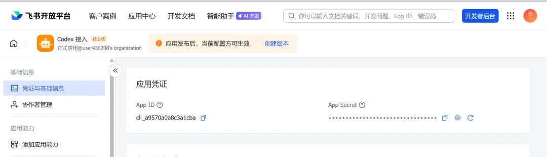 创建完进入应用详情页,左侧菜单「凭证与基础信息」,能看到 App ID 和 App Secret,这两个值后面要用。