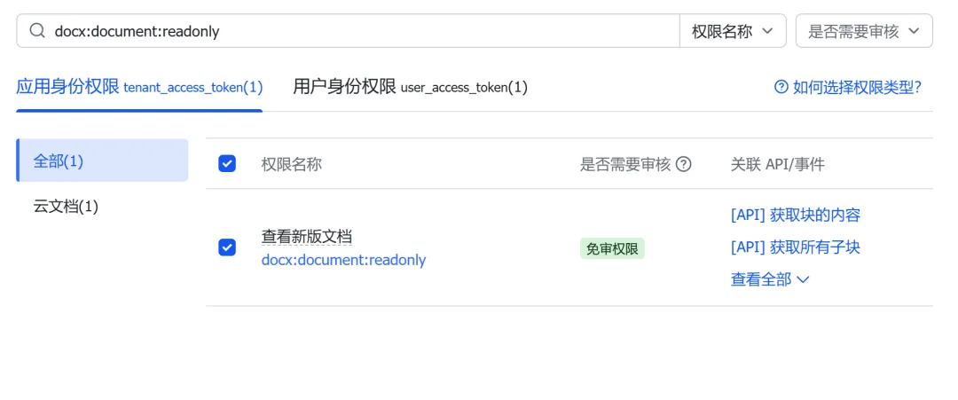 第二步,给应用申请权限。左侧菜单「权限管理」,搜索并申请你需要的权限。读新版文档是 docx:document:readonly,读写新版文档是 docx:document,搜索文档是 search:docs:read,读知识库是 wiki:wiki:readonly,读写知识库是 wiki:wiki,发消息到群是 im:message,读用户基本信息是 contact:user.base:readonly。按你的实际需求选就行,不用全开,开了用不上的权限审批也容易被卡。