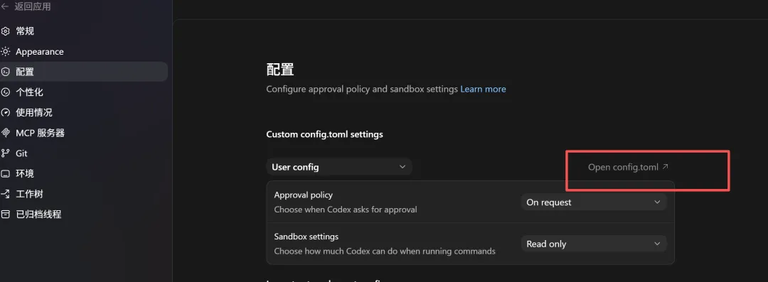 第三步,配置到 Codex。打开 ~/.codex/config.toml,Windows 下是 C:\Users\你的用户名\.codex\config.toml,加上这段。或者你是在找不到位置,就去 codex app 设置里面直接打开