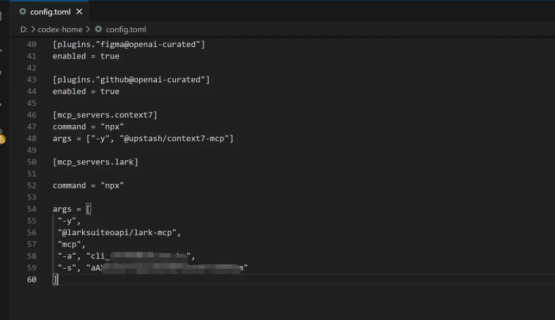 [mcp_servers.lark]command = "npx"args = [ "-y", "@larksuiteoapi/lark-mcp", "mcp", "-a", "cli_你的AppID", "-s", "你的AppSecret"]
