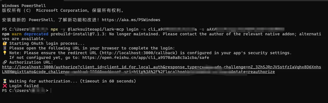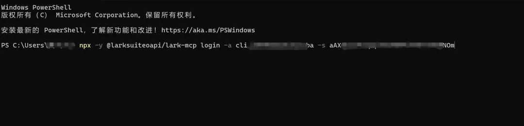 然后执行新的命令:npx -y @larksuiteoapi/lark-mcp login -a cli_xxxx -s your_secret --host 127.0.0.1