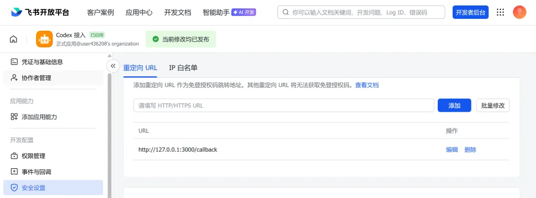 打开安全设置,在重定向 URL里面输入: