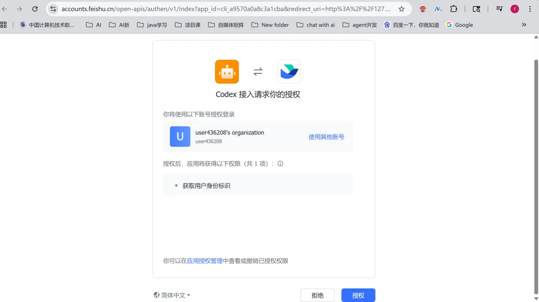 用户身份模式需要先完成一次登录授权。首次配置时一般会弹浏览器让你登录飞书账号,授权完 Token 缓存在本地,后面不用再授权。如果没有自动弹出,可以手动执行一次 npx -y @larksuiteoapi/lark-mcp login -a cli_xxxx -s your_secret 先获取用户 token,再启动 MCP。