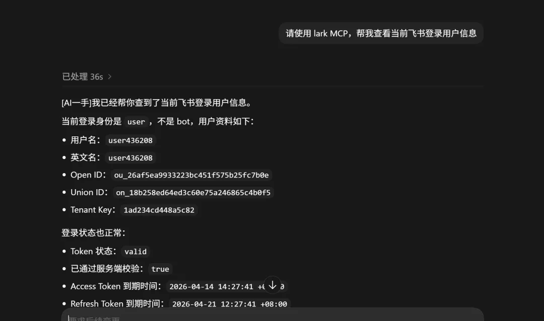 第四步,重启 Codex 验证。进任意线程,输入「请使用 lark MCP,帮我查看当前飞书登录用户信息」,能列出来就是接好了。