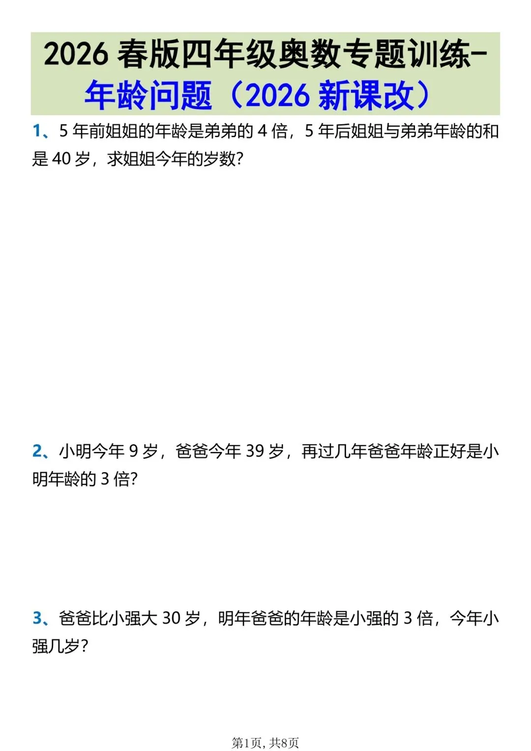 本资料为2026 春季新版,同步四年级下册数学进度,专为小学奥数思维提升打造,聚焦年龄问题这一经典奥数必考专题。