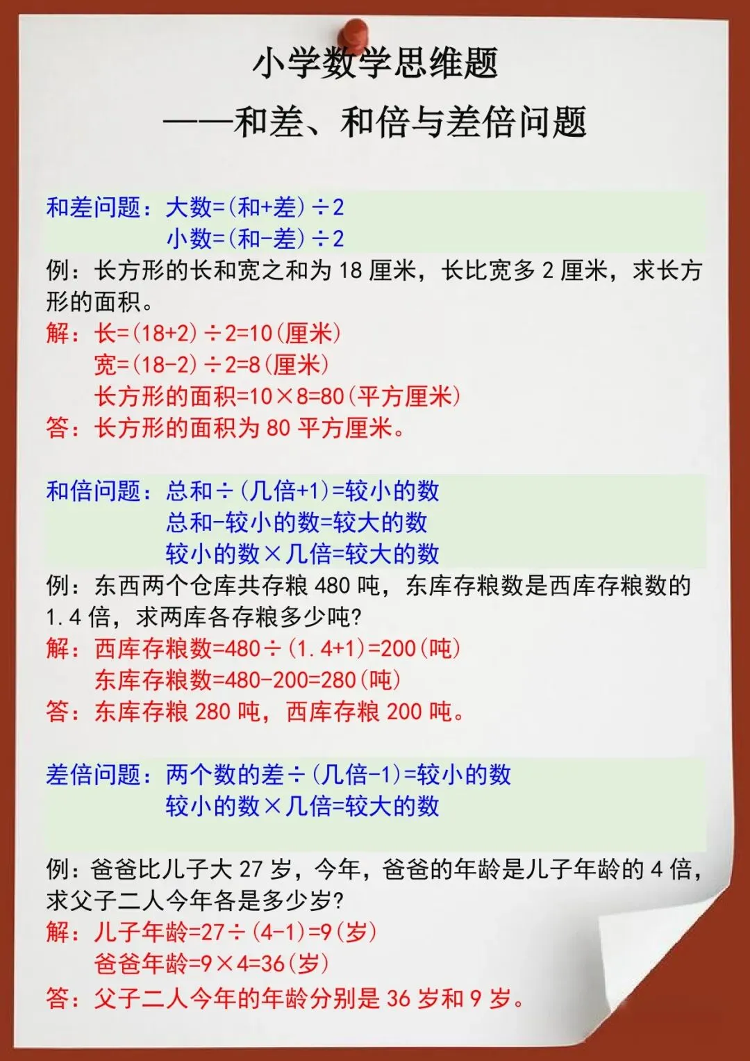 本资料为2026 春季新版,同步四年级下册数学学习进度,聚焦小学中段最核心、必考的三大思维题型:和差问题、和倍问题、差倍问题。