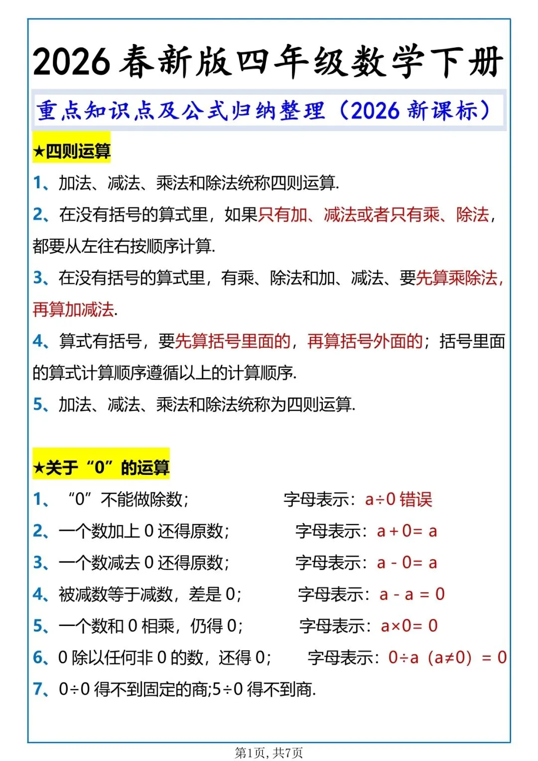 本资料为2026 春季最新版,严格对照人教版四年级下册数学教材,整理全册必背重点知识点 + 核心公式 + 运算定律 + 单位换算,内容精炼、考点清晰,适合孩子课前预习、课堂笔记、单元复习、期中期末考前背诵。