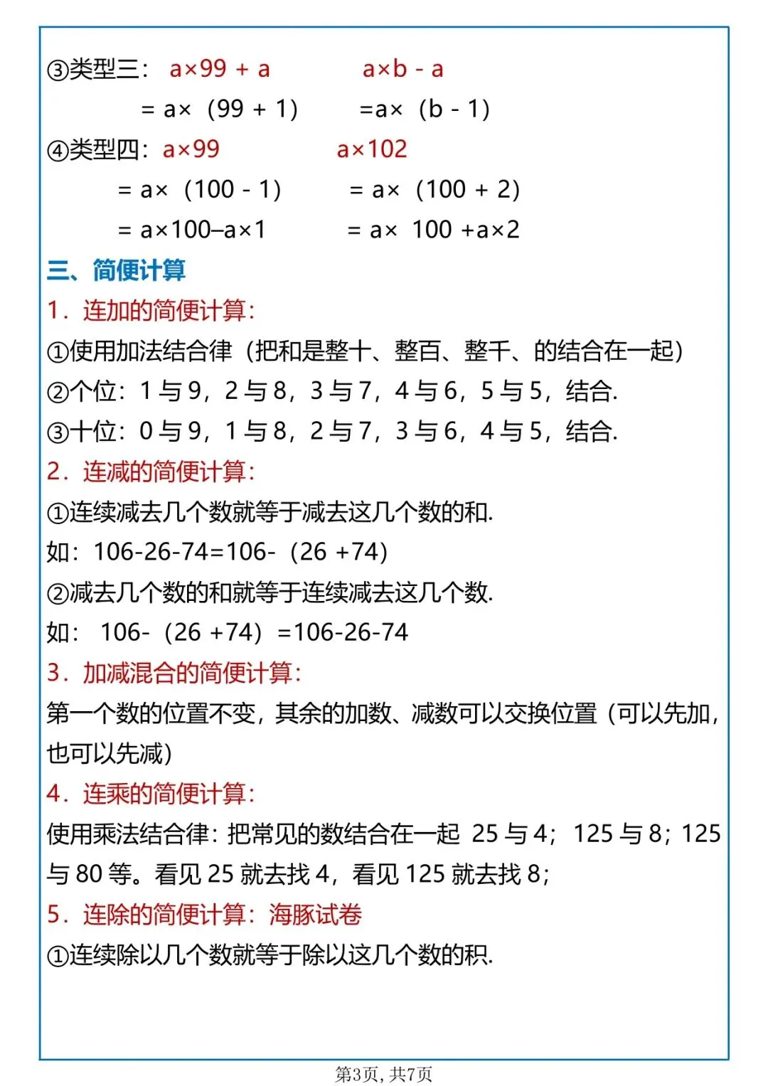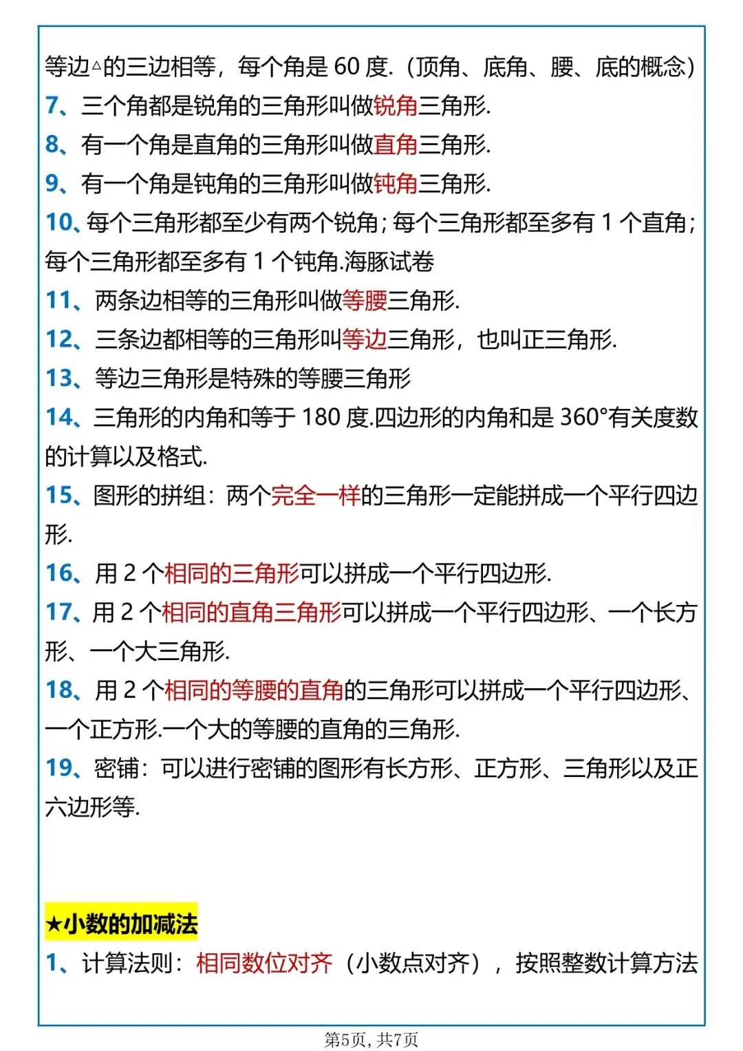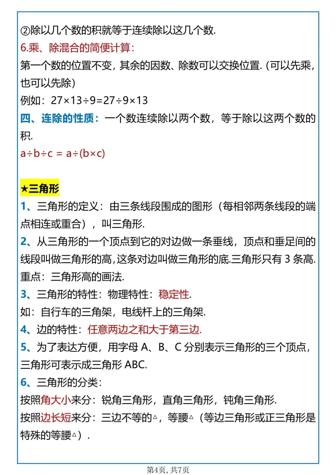 覆盖:四则运算、运算定律、小数的意义和性质、三角形、小数加减法、图形的运动、平均数与条形统计图、鸡兔同笼,全是考试高频得分点,排版清晰可直接打印使用。