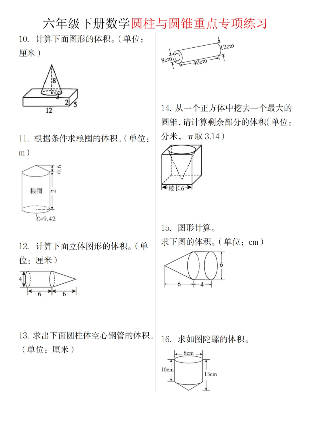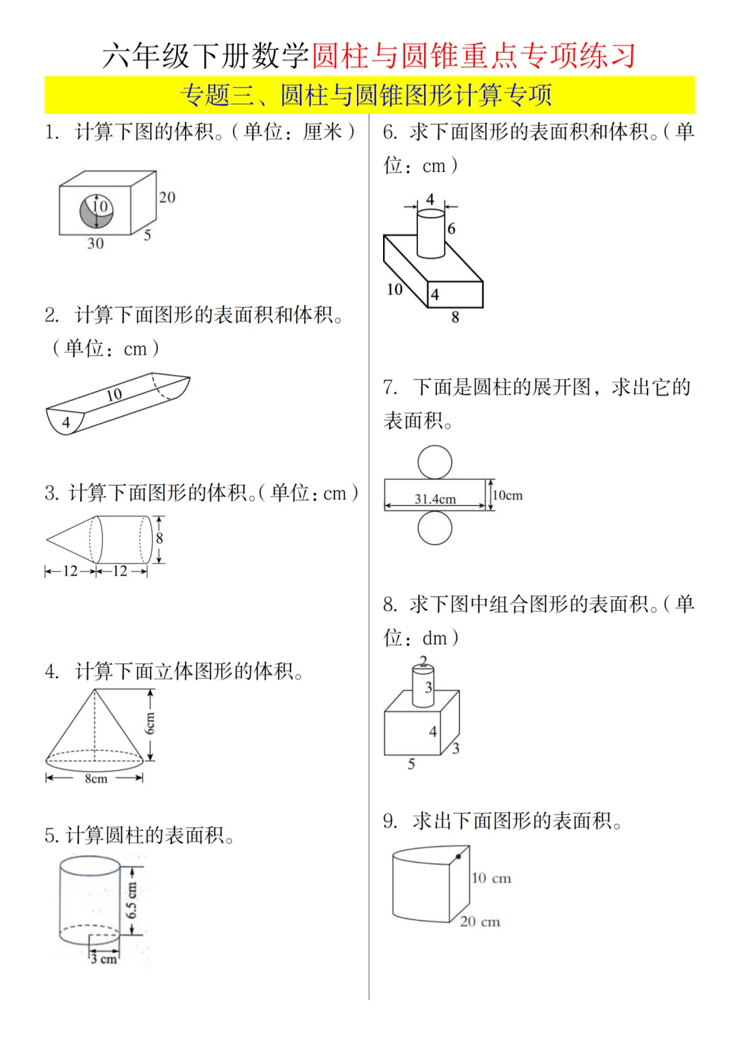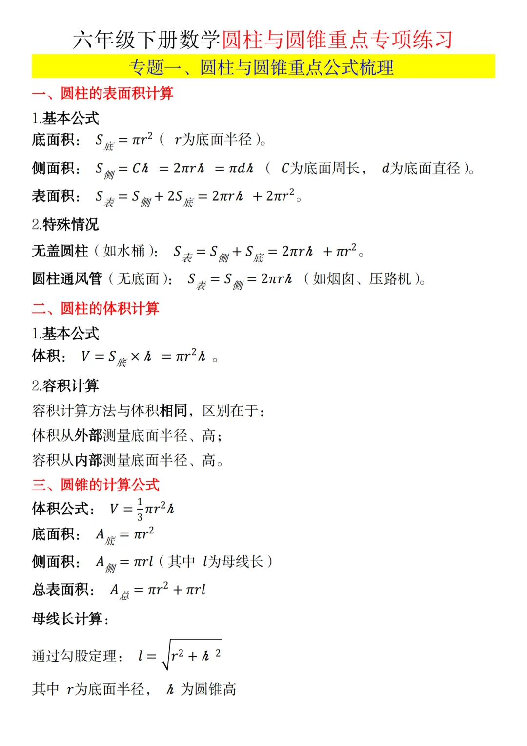 可打印练习!六年级下册数学圆柱与圆锥专项练习,附知识点总结