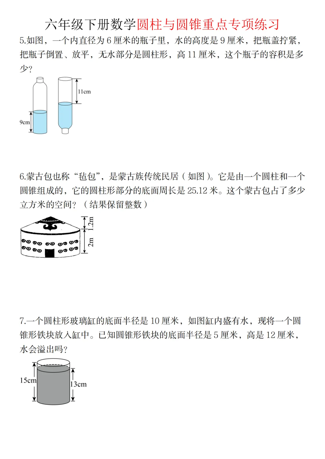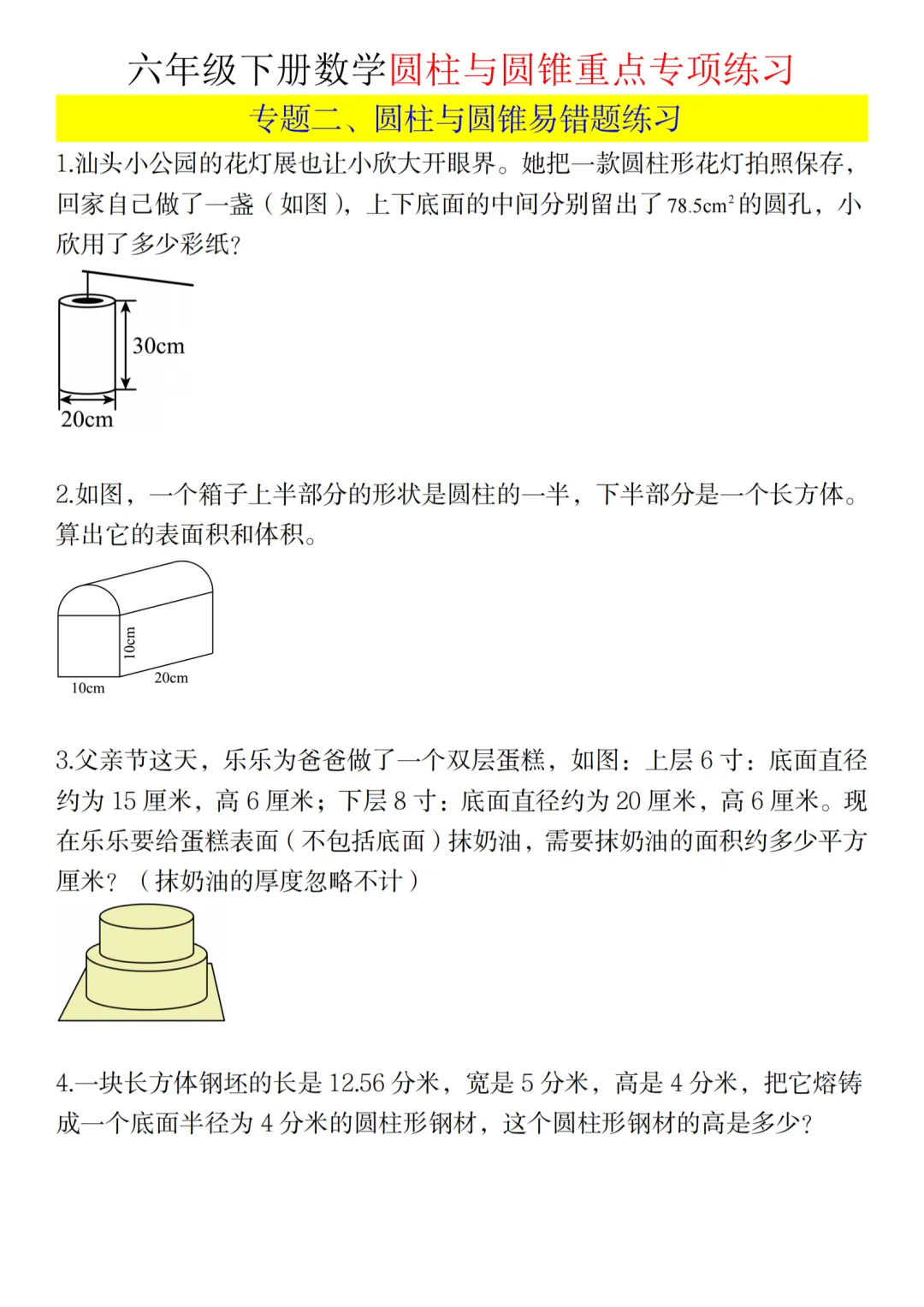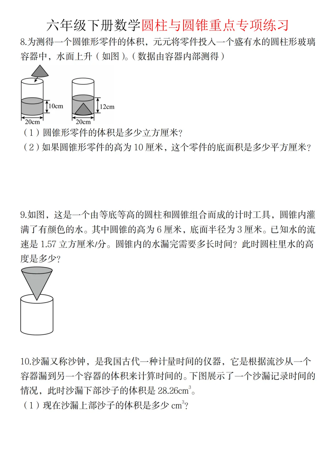 可打印练习!六年级下册数学圆柱与圆锥专项练习,附知识点总结