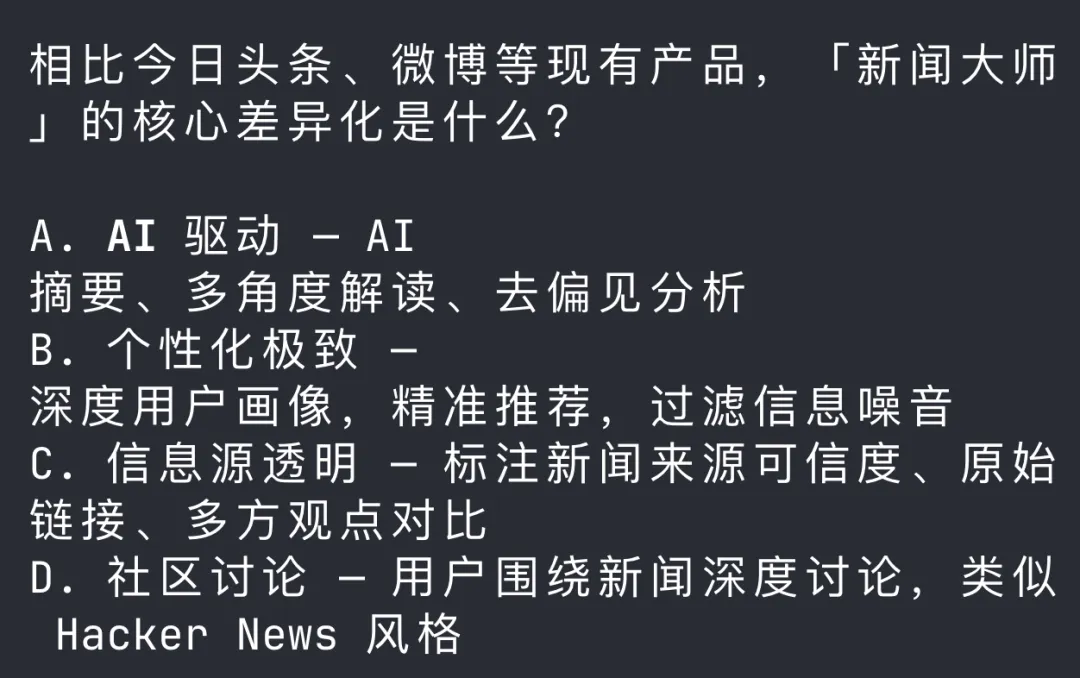 先来拆解一个前面提到的这个AskUserQuestion工具。比如我要做一个新闻大师的 APP,他会主动问: