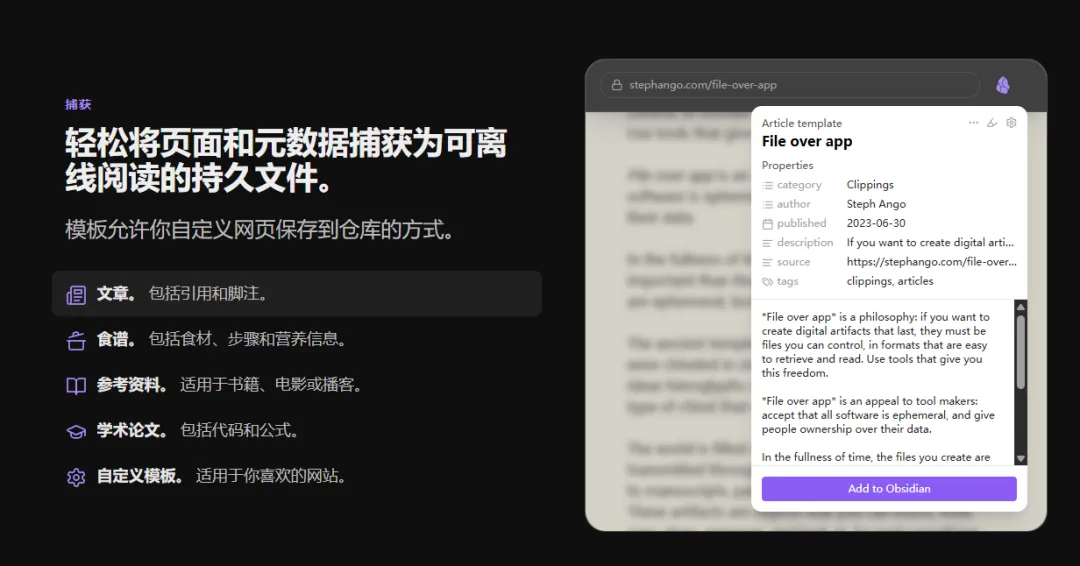 一次点击,把任意网页——连同标题、作者、发布时间、标签等元数据——直接存入你的 Obsidian 知识库,形成可离线阅读的永久 Markdown 文件。