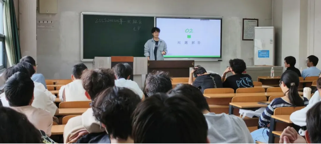 此外,左罗老师还邀请了本专业的两位优秀学长来到现场,分享他们的大学生活和成长经历。胡学长坦诚地和大家分享了自己大学生活中的感悟,叮嘱同学们要珍惜大学时光,主动参与学科竞赛和科研项目,在实践中锤炼专业技能、培养严谨的学习态度。李学长则讲述了自己转专业的经历,分享了自己适应新专业的努力,以及在备赛过程中如何提升专业技能、积累实践经验,如何锻炼自身抗压能力和团队协作能力的真实故事,为同学们提供了鲜活且实用的参考。