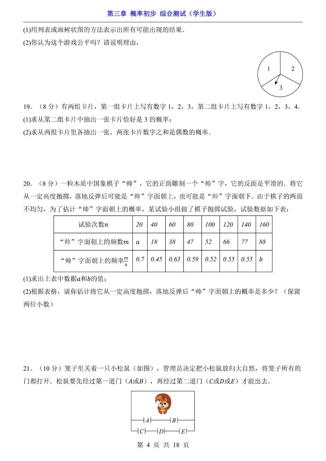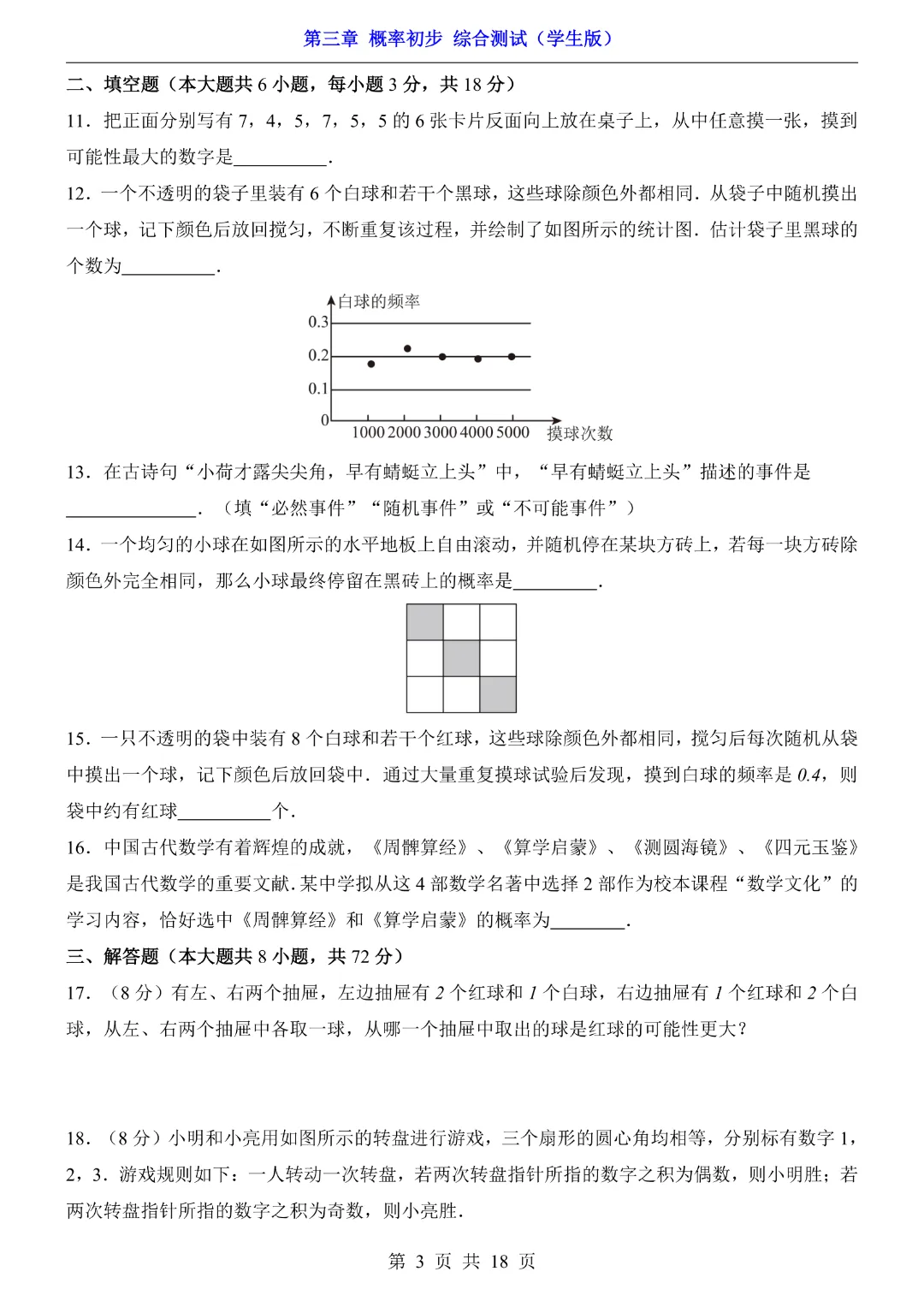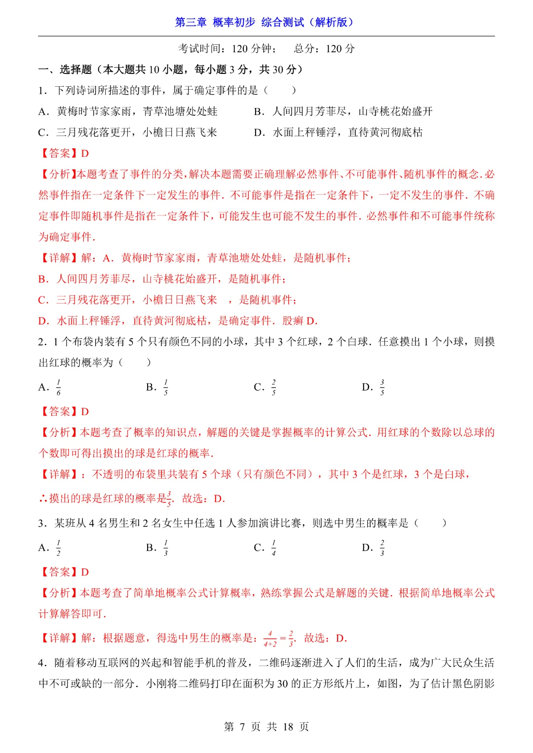 26春新版七年级下册数学【北师大版】初一下册数学《第3章概率初步 综合测试带答案解析》丨完整电子版可打印