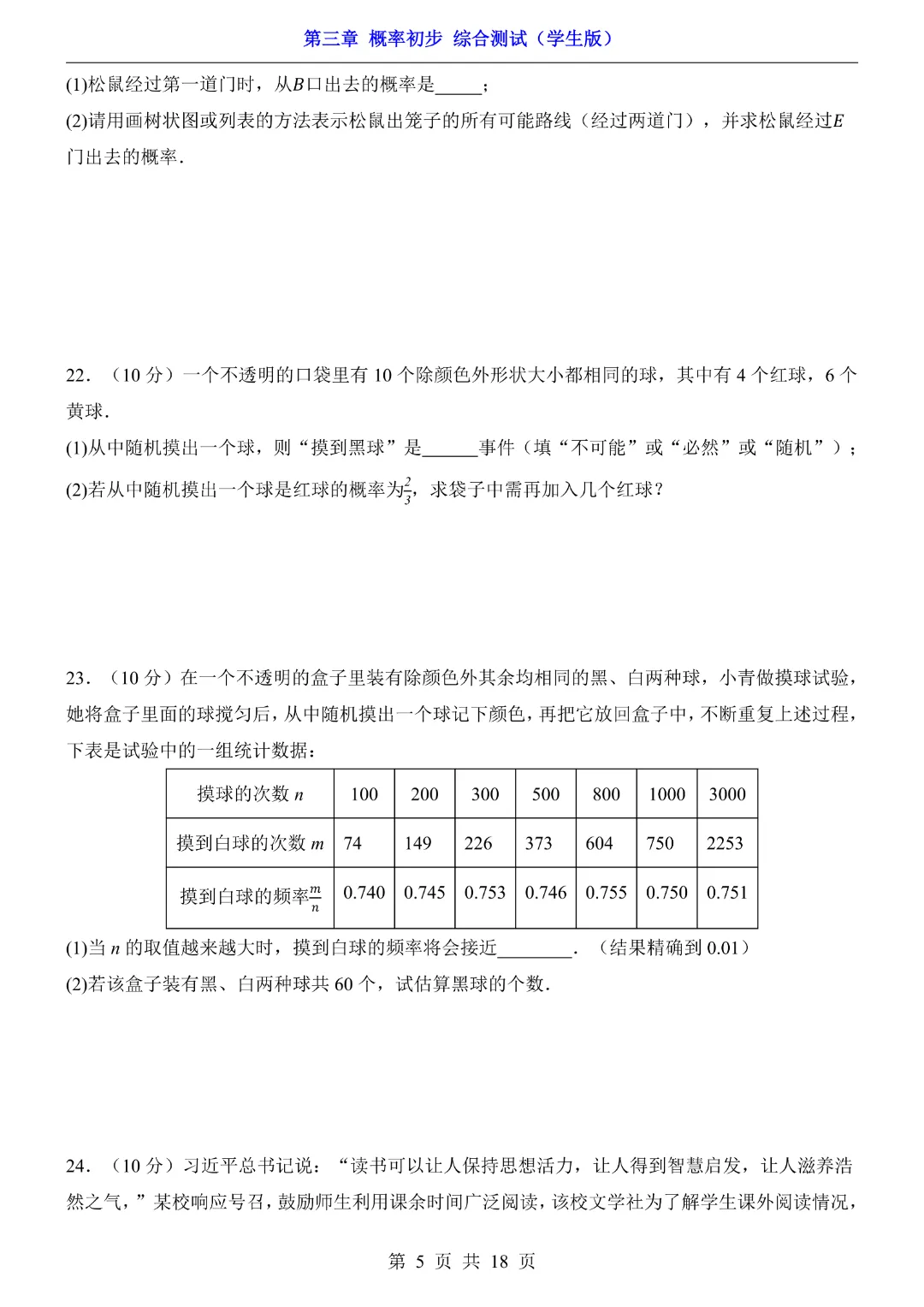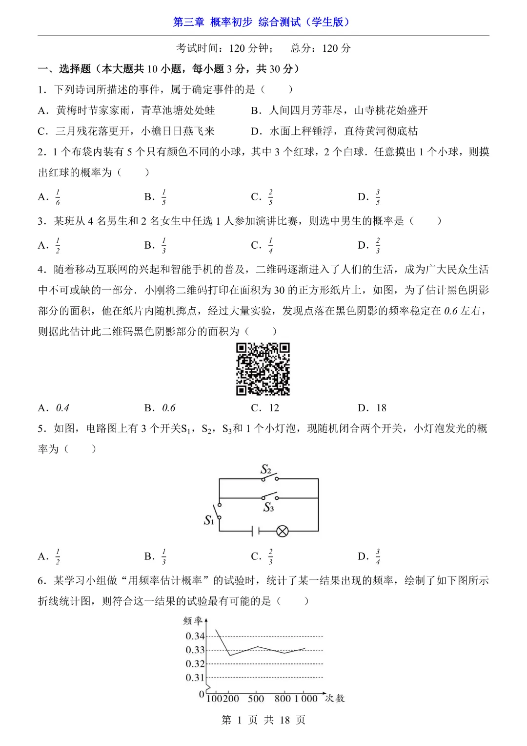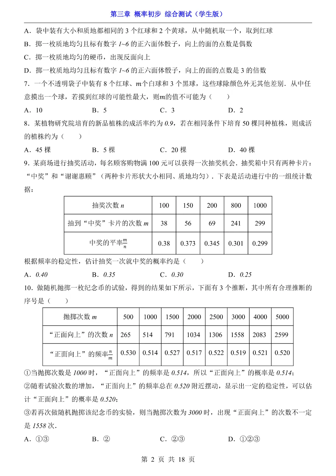 26春新版七年级下册数学【北师大版】初一下册数学《第3章概率初步 综合测试带答案解析》丨完整电子版可打印
