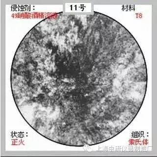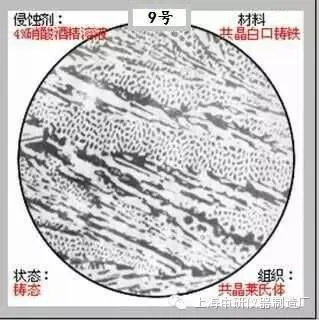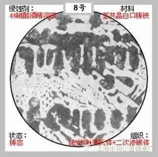 8、P+Ld+Fe3Cll,斑点装基体为共晶Ld,黑色枝晶为P。
