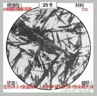 25、低温回火组织M+Ar,粗针状黑色回火M体及灰白色的残留Ar。