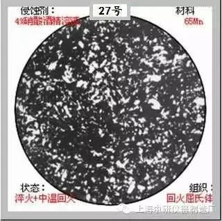 27、回火T。白色F基体上分布极细的黑色Fe3C颗粒,它仍保持M位向。