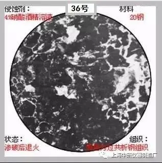 36、渗碳的平衡组织。最表层为过共析层,黑色基体为P,白色网络为Fe3Cll。
