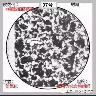 37、软氮化组织。白色表层为多相化合物,其结构一般为:Fe4N、Fe3N、CeN的混合组织。比较致密,余为回火索氏体。