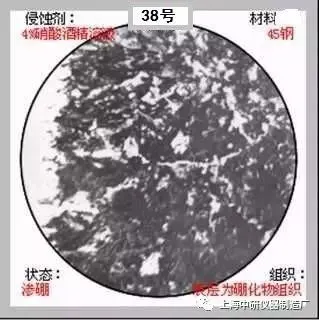 38、渗B组织。表层白色为硼化物Fe2B相,呈现齿形契入基体中。