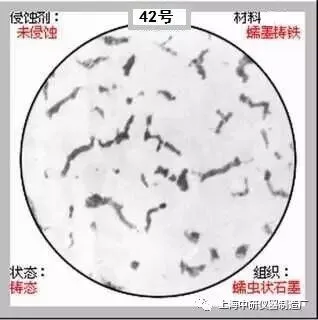 42、蠕墨铸铁的石墨形态。蠕墨铸铁的石墨结构处于片状石墨和球状石墨之间,其特征石墨的长与厚之比值较小,片厚短,两端都圆钝。
