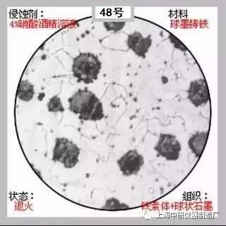 49、F+P基球墨铸铁。黑色球状为石墨,白色F环绕于球状石墨周围,成为牛眼状组织。