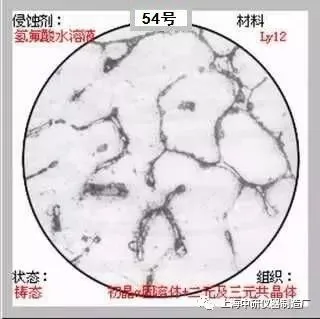 54、白色为∝(AL)基体与深黑色的[∝(AL)+θ相)CuAl2)+S相(Al2CuMg)]三元共晶及[∝(AL)+θ相)CuAl2)]二元共晶。三元、二元共晶均呈网络分布,难于分辨。