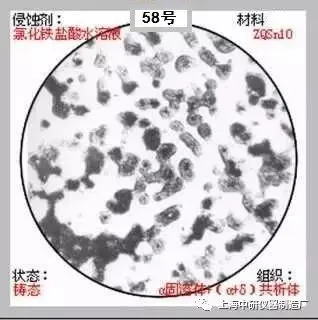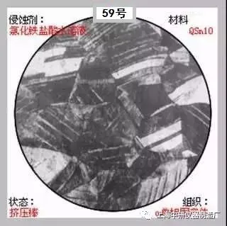 57、双相黄铜组织。白色部分为∝固溶体基体,黑色条块状是以电子化合物CuZu为基的β固溶体。