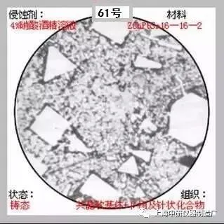 61、∝+(∝Pb)+β)共+Cu2Sb)组织白色方块为β相(SnSb)硬质点。部分针状为铜锑化合物(cu2Sb),其余为(∝+(Pb)+β)共晶软基体。