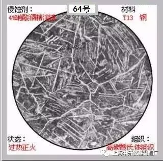 64、高碳魏氏体。黑色块状为P,白色网络为Fe3C,Fe3C呈针状插入、甚至穿透P晶粒。