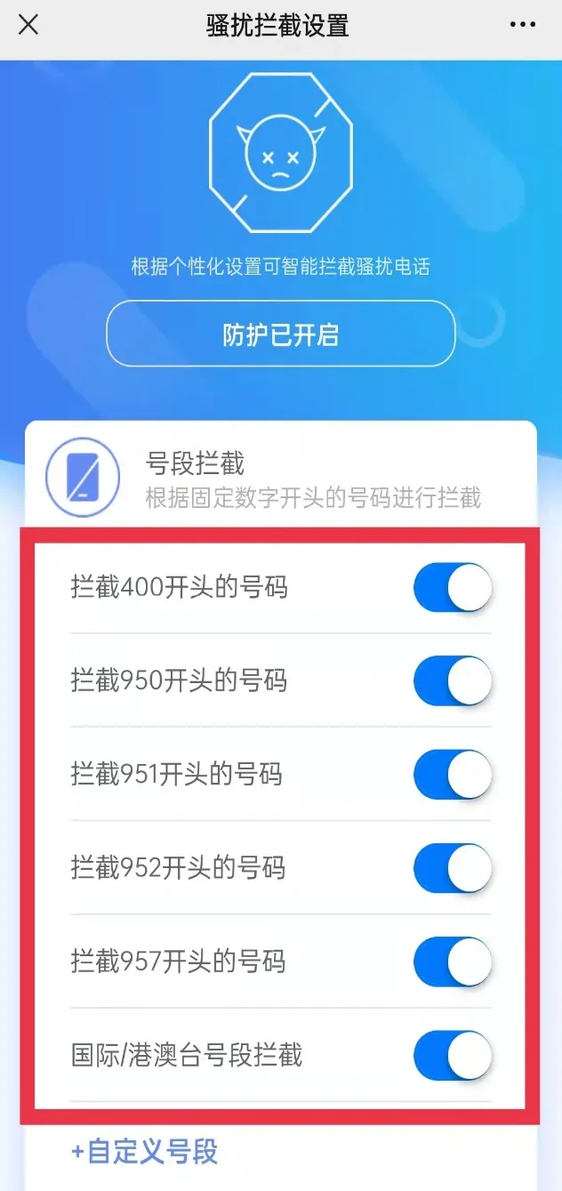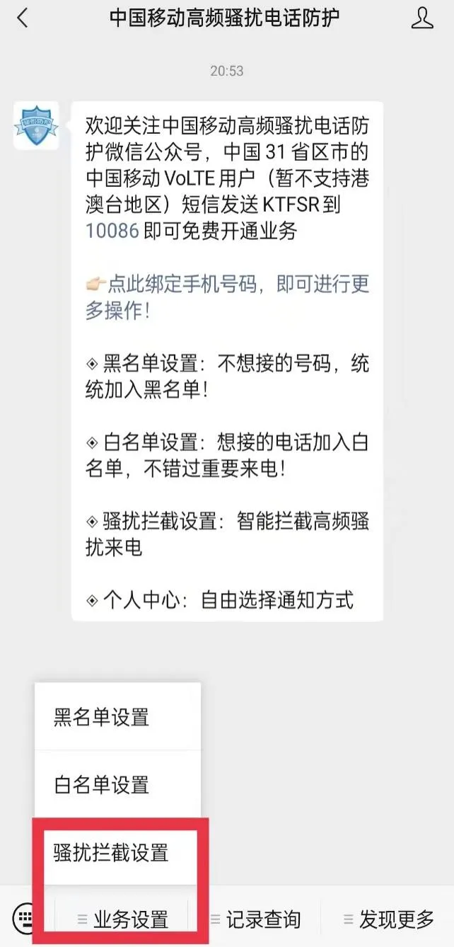 关注“中国移动高频骚扰电话防护”公众号,点击业务设置,选择骚扰拦截设置,可开启对应号段的拦截功能和国际号段拦截功能,以及在以后遇到非上述的骚扰电话或者境外电话可以自定义号段。