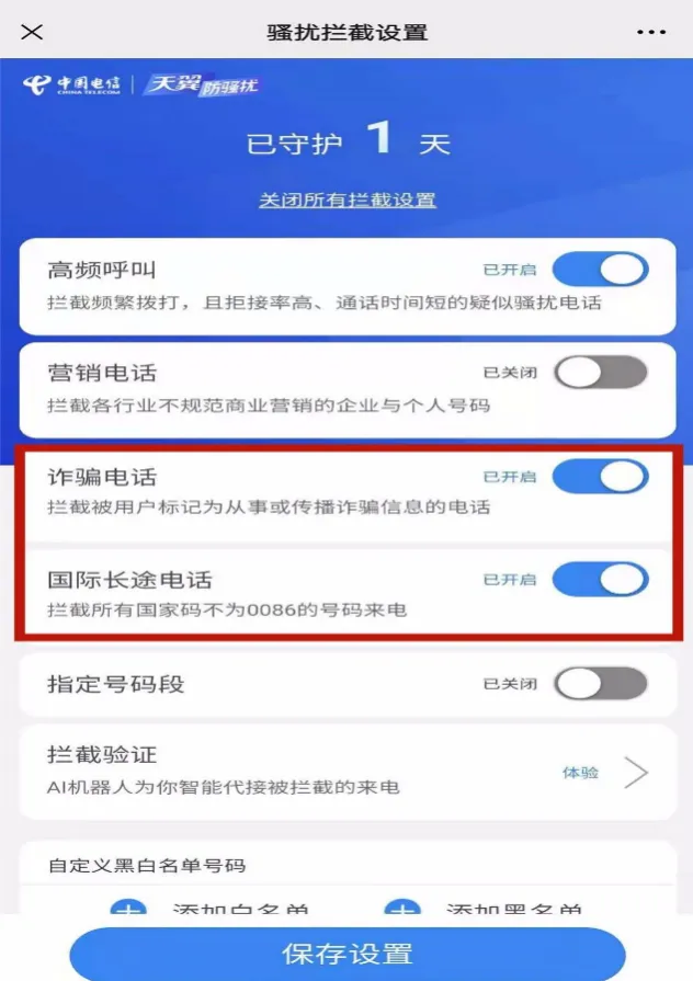 关注“天翼防骚扰”公众号,点击业务设置,选择智能拦截设置,开启国际长途电话、诈骗电话拦截功能。