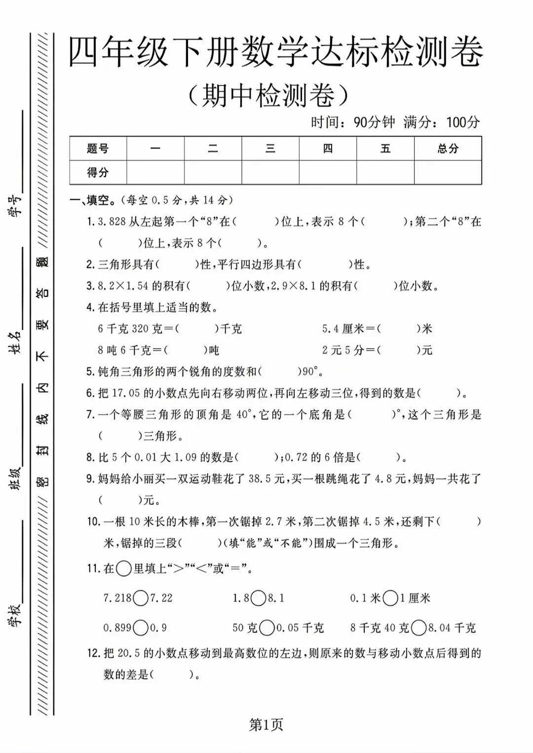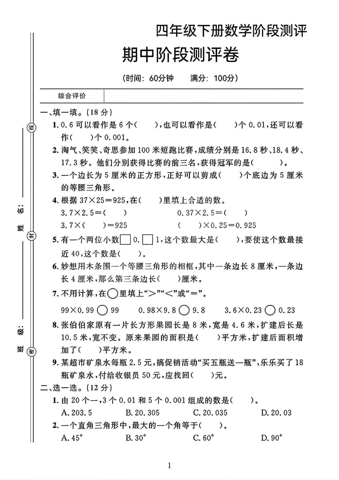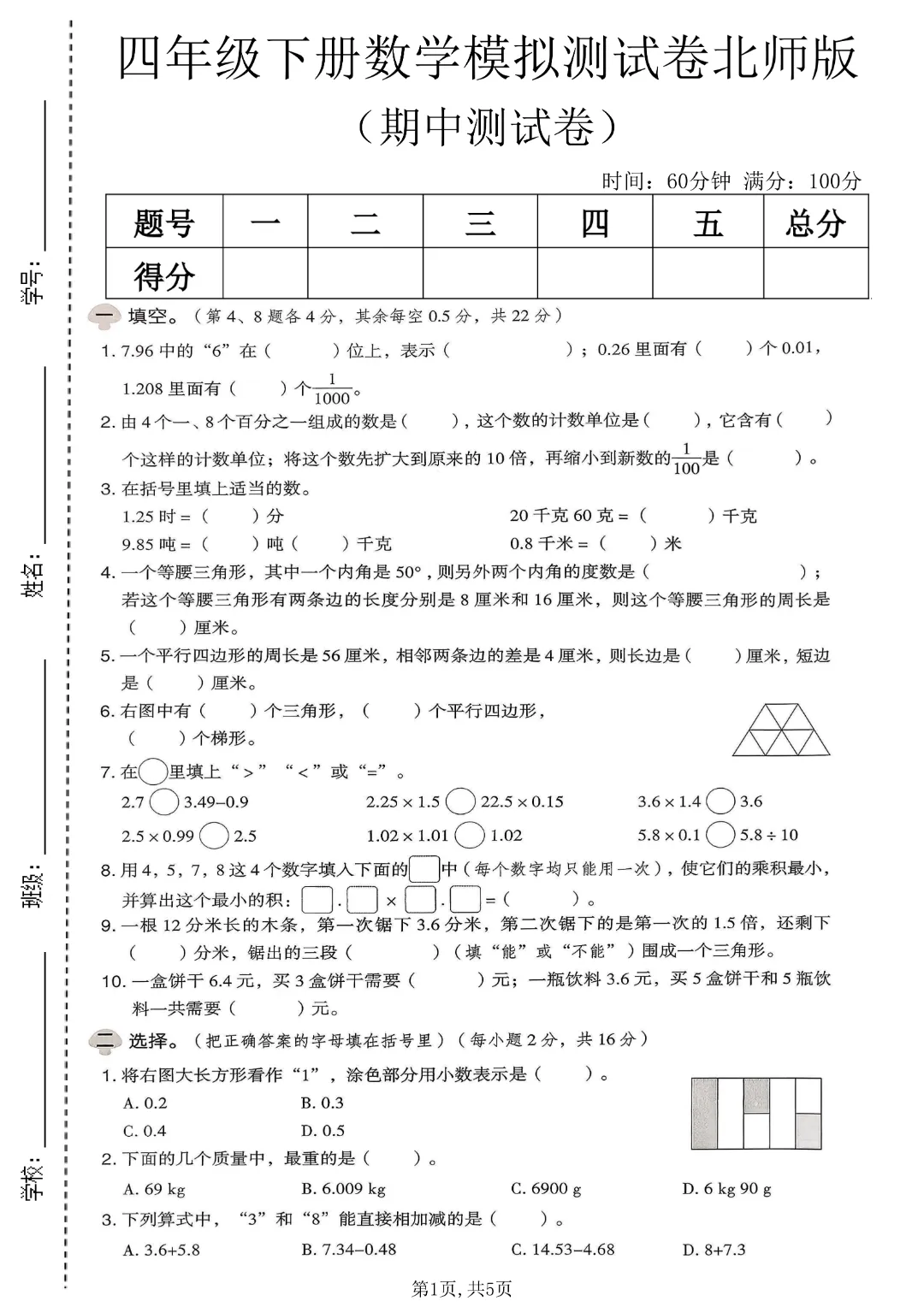 今天给大家分享的是:26新四年级下册数学【北师大版】【期中测试卷3套带答案】丨完整高清电子版可打印
